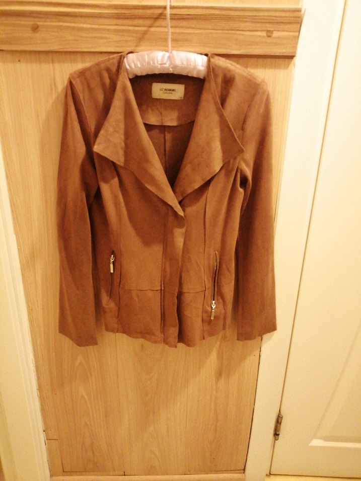 Kahverengi süet kumaştan, düğmeli ve normal midi boyda, uzun kollu, kesimli kadın ceket. Notched lapel yakasıyla trend ve rahat bir stil sunar.