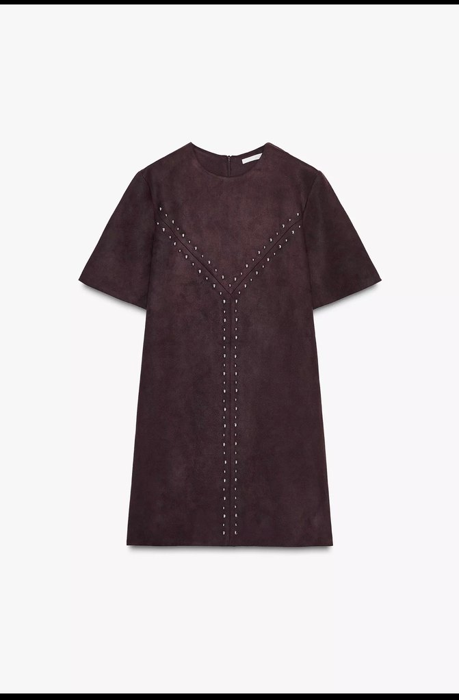 Kahverengi süet kumaştan, kısa kollu, düğmeli ve işlemeli desenli, midi boy, dar kesim elbise. Romantik akşamlar için uygun şık bir tercih.