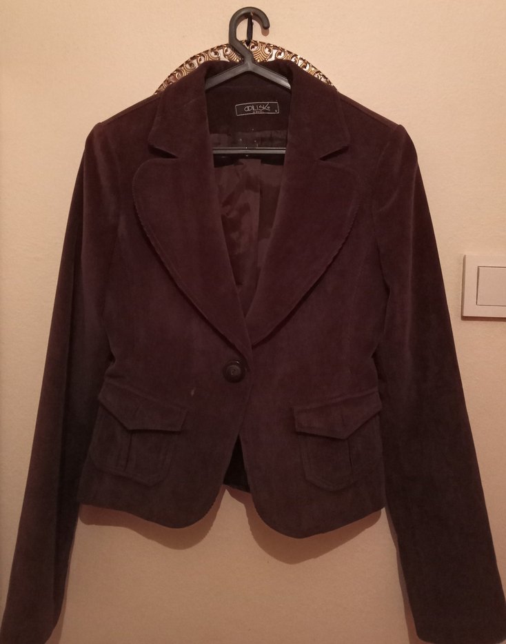 Kahverengi süet kumaştan, düğmeli, normal boy midi kadın blazer. Notch yaka, uzun kollu ve düzenli kesim, ofis için uygun şık goth tarzı.