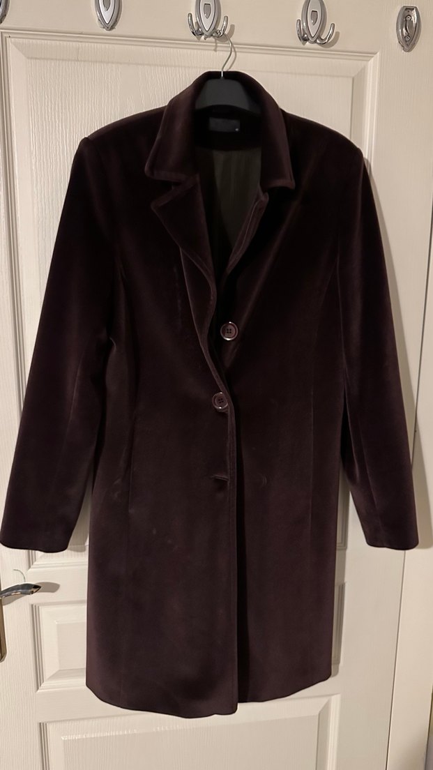 Kahverengi süet kadın kaban, düğmeli ve keskin yakalıdır. Uzun kollu, midi boyda, klasik ofis şıklığı için uygundur.