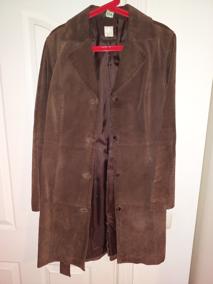 Kahverengi süet malzemeden yapılmış, düğmeli ve uzun kollu hamile kabanıdır. Notlu yaka ve uzun boyu ile ofis kullanımına uygundur. Hakiki suet Franse markasi