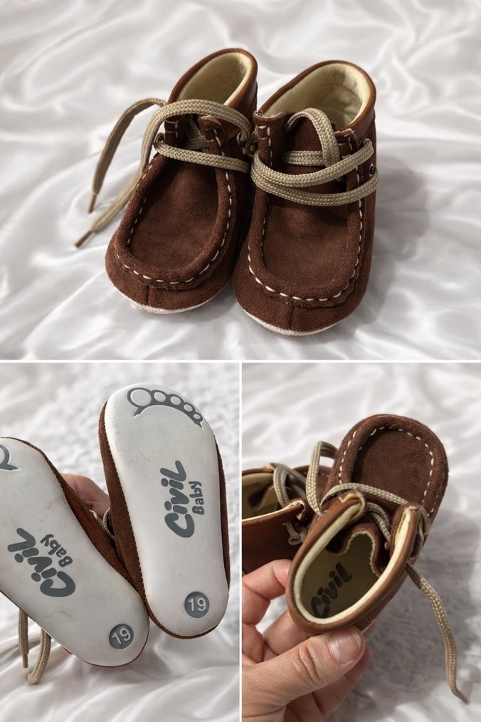 Kahverengi süet malzemeden, tokalı, 19 numara erkek bebek ilk adım ayakkabısı. Yumuşak astarlı ve rahat tasarım. Minik Ayaklara Büyük Konfor Civil Baby marka, 19 numara kahverengi süet ayakkabı Yumuşacık yapısı ve esnek tabanı sayesinde minik adımlar için çok rahat. Sadece birkaç kez giyildi, tertemiz ve yeniden farksız durumda. Bağcıklı modeli hem şık hem de ayağı güzel kavrıyor. “Anne ben hazırım” diyen ilk adımlar için birebir Dolapta beklemesin, yeni minik sahibine kavuşsun ✨