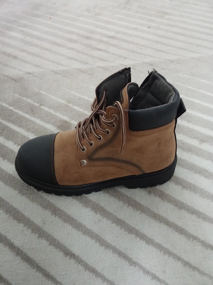 Kahverengi süet erkek bot, gri burun ve siyah dolgulu yakaya sahip. Kemer detaylı ve bağcıklı, günlük rahat kullanıma uygun.