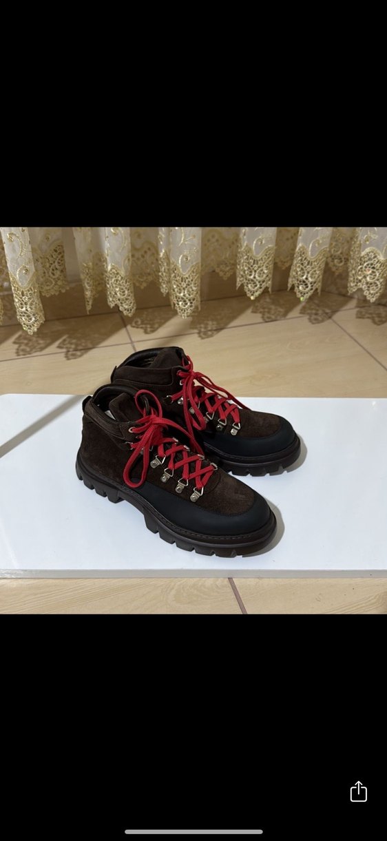 Kahverengi süet erkek platform topuklu botlar, kırmızı bağcıklı ve tokalı detaylara sahip, dış mekan sokak stili için uygun.