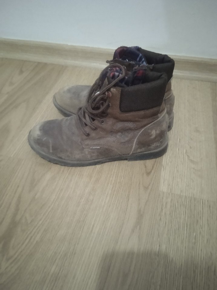 Kahverengi süet erkek botlar, bağcıklı ve tokalı detaylı, sokak stili ve günlük kullanım için uygundur. Gri tonları ve rahat bir görünüme sahiptir.