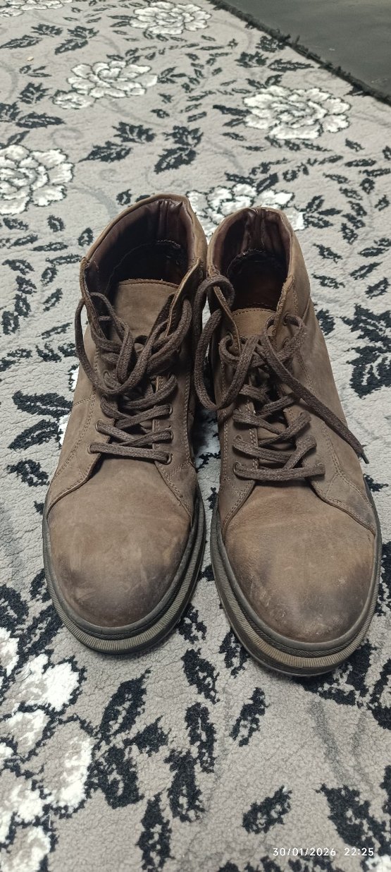 Kahverengi süet erkek botlar, bağcıklı ve tokalı detaylara sahip. Günlük sokak tarzı için uygun, düz ve desen içermeyen yüzeyli.