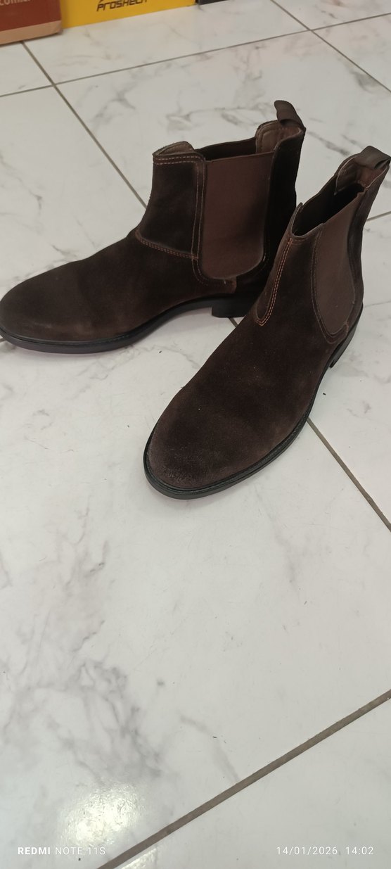 Koyu kahverengi süet erkek botları, tokalı detaylı, minimalist tarzda günlük sokak giyimi için uygundur. Rahat ve trend bir görünüme sahiptir. sıfır ürün hiç kullanılmadı kauçuk tabanlı 43 ve 44 numaralari var Bambi nubuk %100 deri