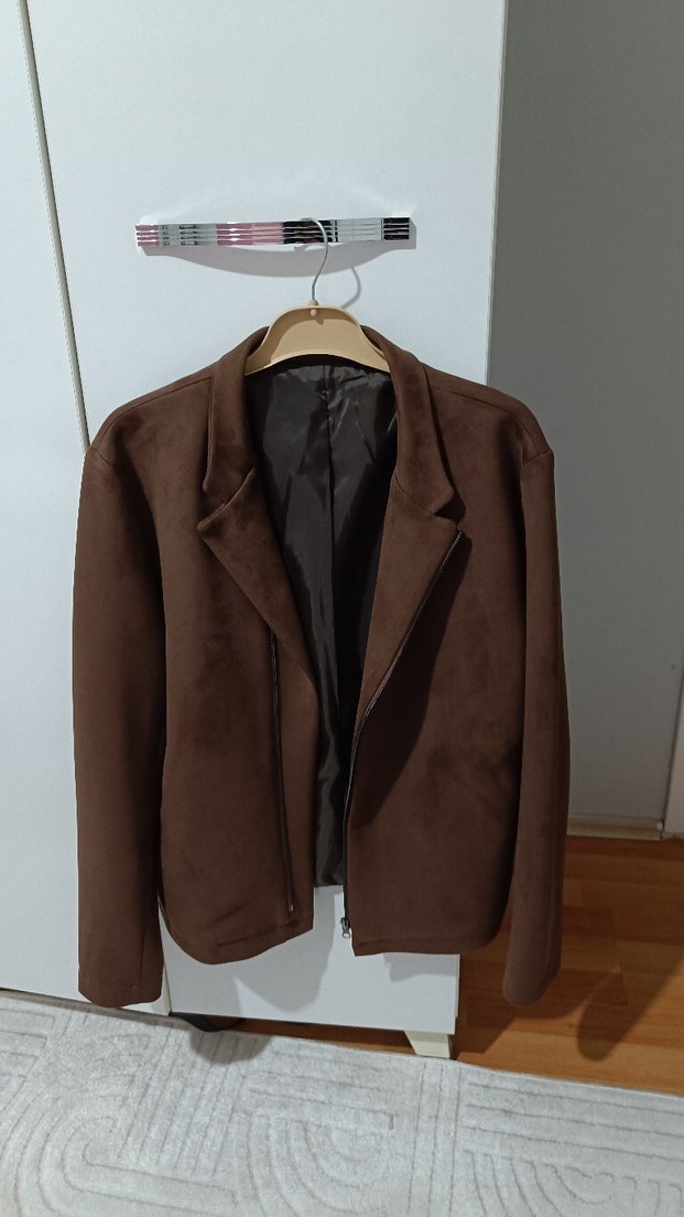 Kahverengi süet kumaştan yapılmış, çıtçıtlı yaka ve fermuarlı ön kapamaya sahip erkek ceket. Normal kesim, uzun kollu ve midi boyda, günlük kullanıma uygun.