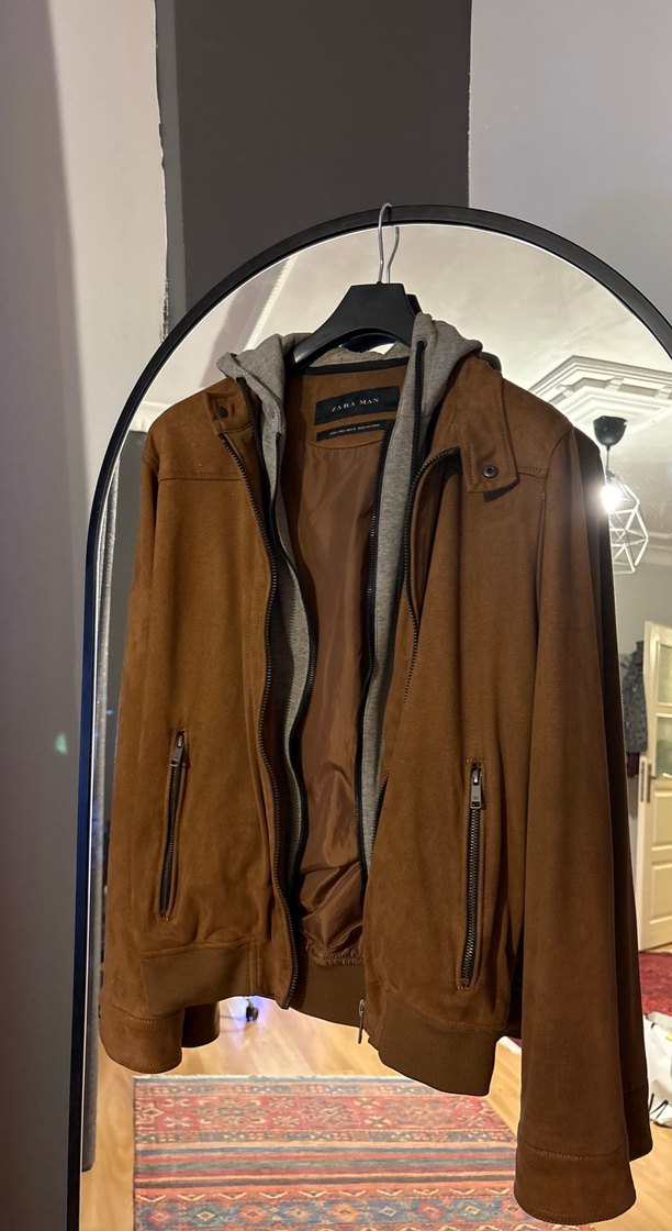 Zara Marka Kahverengi süet erkek ceket, çıtçıtlı yaka ve fermuarlı ceplerle. Gri kapüşonlu iç detay ve normal kesim, günlük kullanıma uygun.