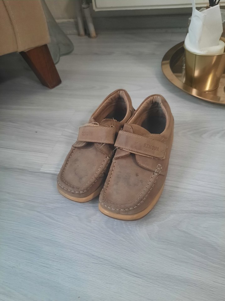 Kahverengi süet erkek çocuk loafer, tokalı ve sade, klasik bir görünüme sahip.