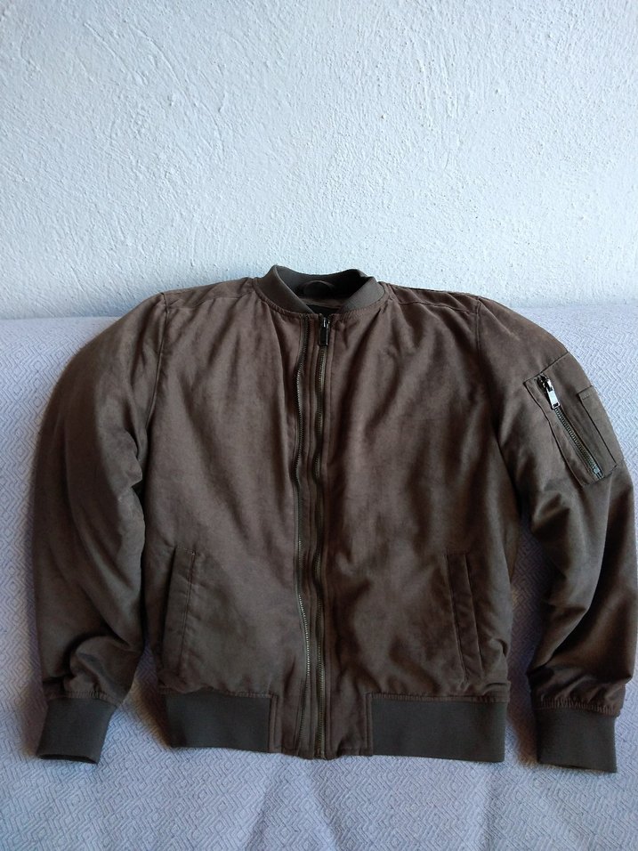 Kahverengi süet kumaştan, fermuarlı, uzun kollu, bisiklet yaka ve dar kesim erkek ceket. Günlük sokak stili için uygun.