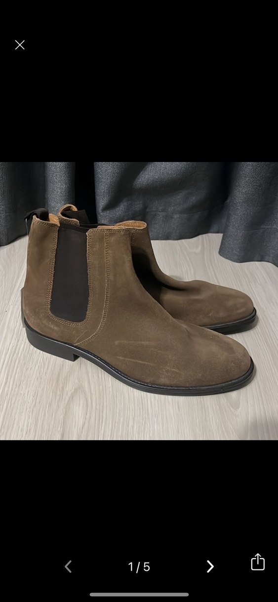 Kahverengi süet erkek bot, tokalı detaylı, günlük ve sokak stiline uygun. Gri elastik yan panelleriyle sade ve şık tasarım sunar.