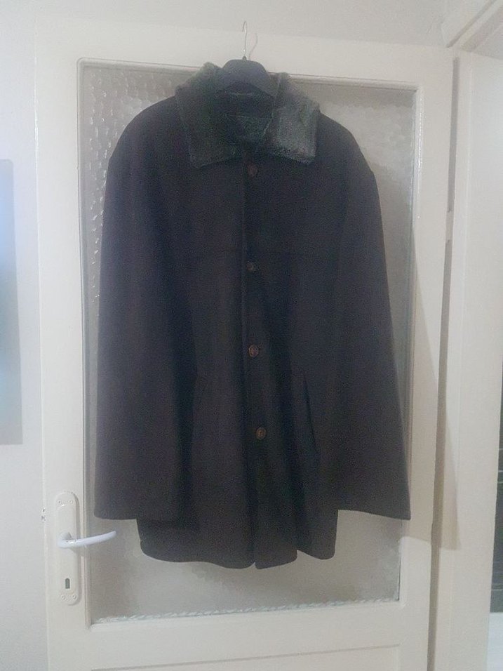 Kahverengi süet erkek ceketi, düğmeli ve keskin yaka detaylıdır. Uzun kollu ici komple kurktur