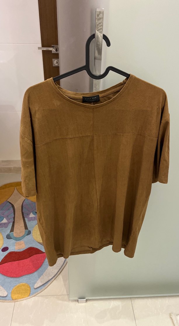 Kahverengi süet kumaştan, kısa kollu, yuvarlak yakalı Günlük rahat kullanıma uygun, yumuşak dokusu şıklık katıyor. Erkek ürünü ama kadın da kullanabilir L beden ancak dar kalıp m s daha uygun olur
