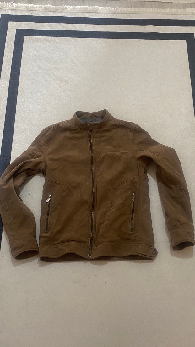 Kahverengi süet malzemeden, fermuarlı ve uzun kollu, sade tasarımlı erkek ceket. Günlük kullanıma uygun, fit kesim ve klasik yaka detaylı.
