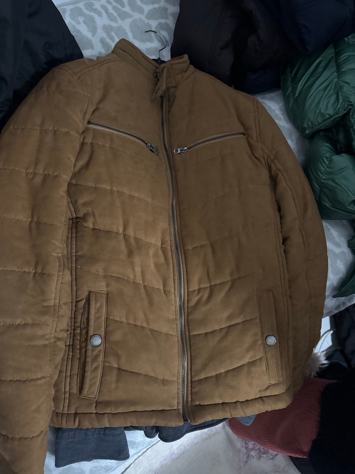 Koyu kahverengi süet malzemeden, fermuarlı ve kesik yaka detaylı, uzun kollu, midi boy, erkek sokak stili ceketi. M VE S BEDEN RAHAT KULLANABİLİR