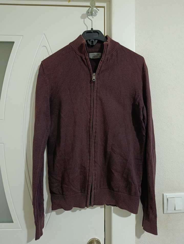 Kahverengi süet kumaştan fermuarlı, bisiklet yaka erkek kazak. Uzun kollu, normal kesim ve midi boyda, günlük rahat kullanıma uygun.