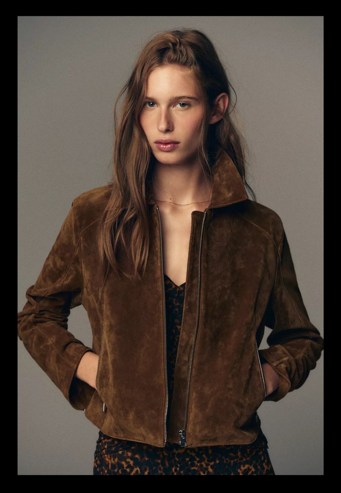 Kahverengi süet ceketin parlak bir görünümü, fermuarlı önü ve iki fermuarlı cebı vardır. Yaka tipi notched lapel, uzun kollu ve normal kesimdir, ofis ve günlük kullanım için uygundur.