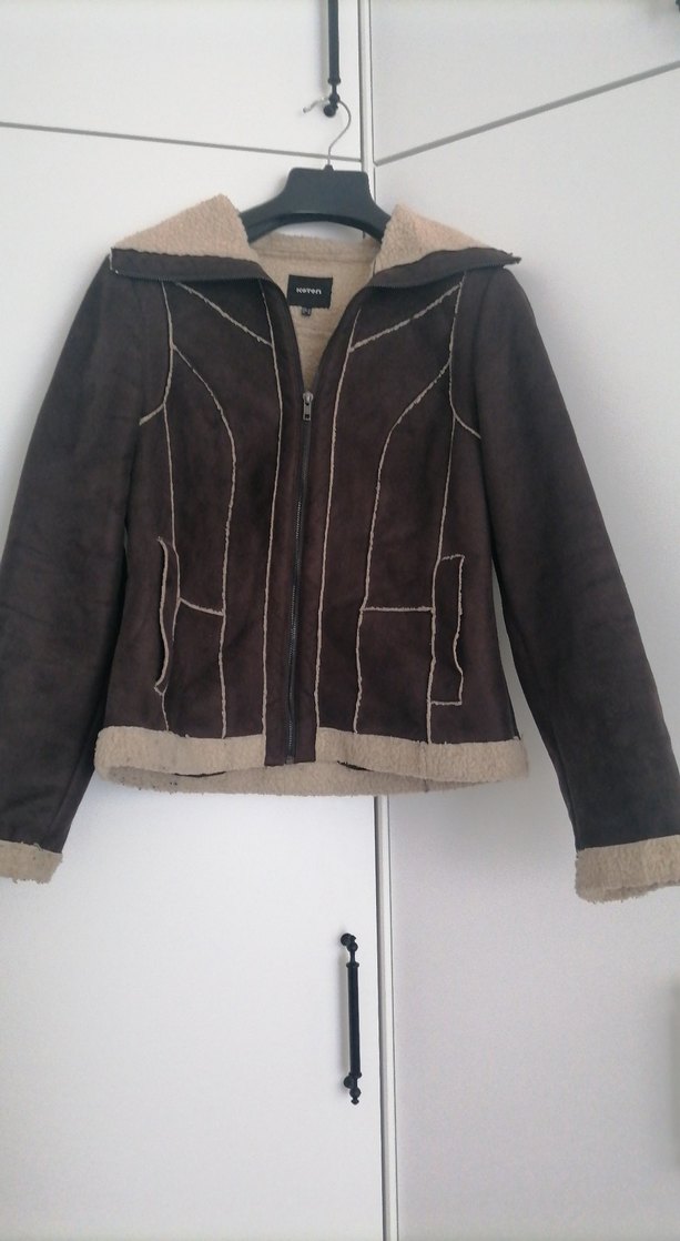 Kahverengi süetten fermuarlı, yakası kesik ve uzun kollu kadın ceket. Rahat ve şık, günlük sokak stiline uygun.