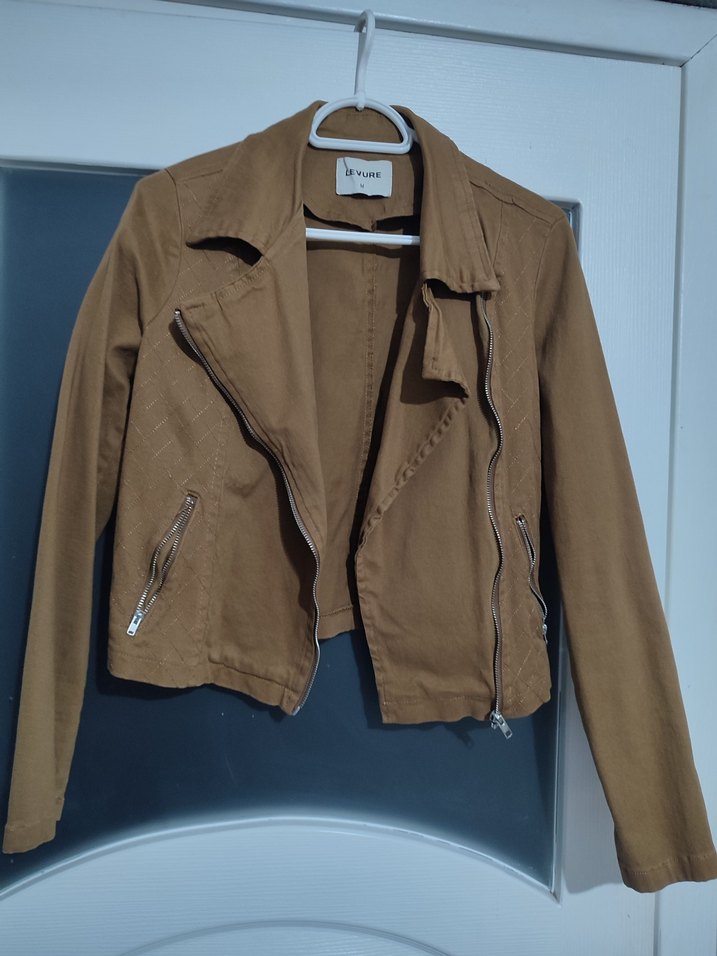 Kahverengi süet deri ceket, kesik yakalı ve fermuarlı ceplere sahiptir. Dar kesim, normal boy ve uzun kolludur, günlük sokak stiline uygundur. hiç giyilmedi esnek bir yapısı var hiçbir sıkıntısı yok