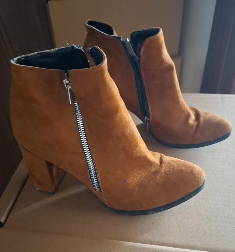 Kahverengi süet kadın botları, blok topuklu ve parlak görünümlü. Yanında fermuar bulunan bu botlar sokak stili ve günlük kullanım için uygundur.