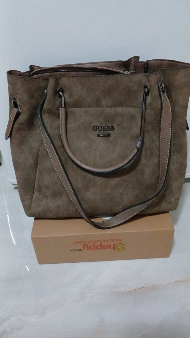 Guess markalı kahverengi süet kadın çanta, tokalı ve desenli tasarımıyla günlük ve sokak stiline uygun.