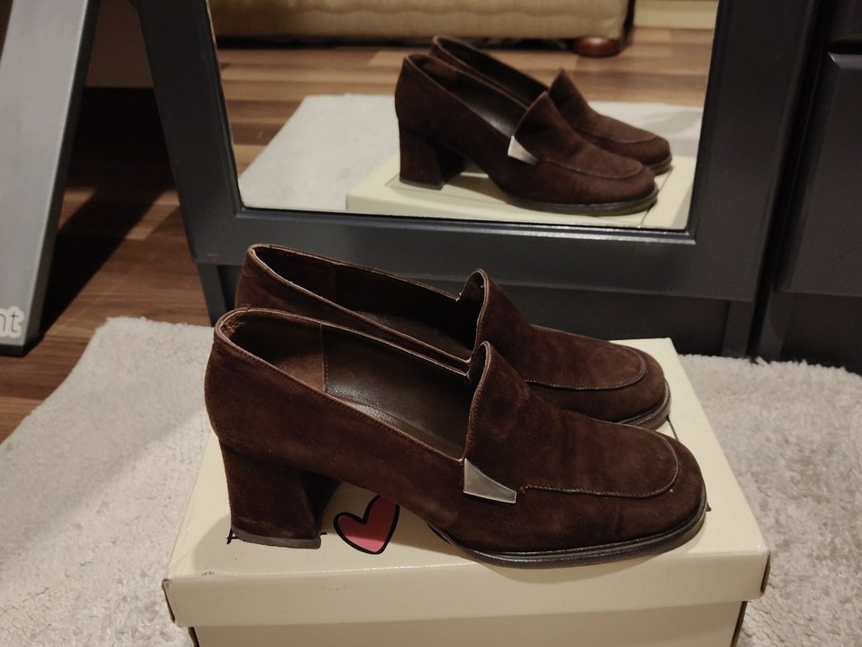 Kahverengi hakiki deri süet, 38 numara, blok topuk ve toka detaylı kadın klasik topuklu ayakkabı. Vintage giyime uygun.