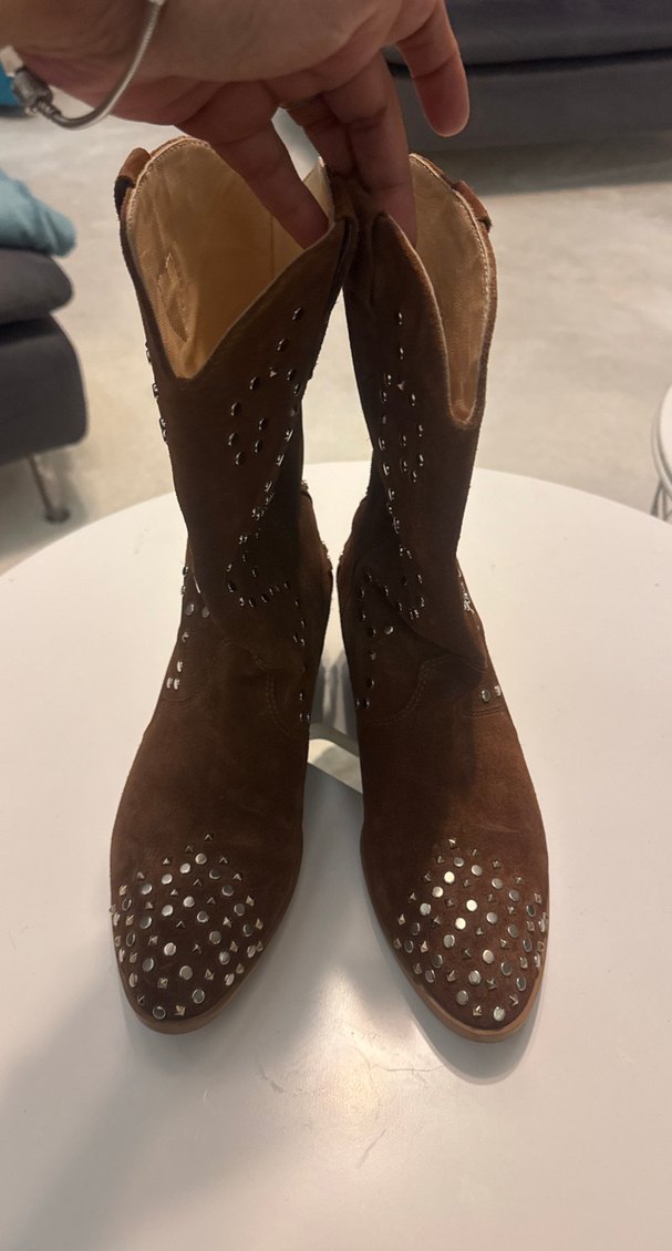 Koyu kahverengi süet, işlemeli ve tokalı yüksek topuklu kadın botları. Bohem tarzıyla Paris retro ve hippie havası taşıyor.