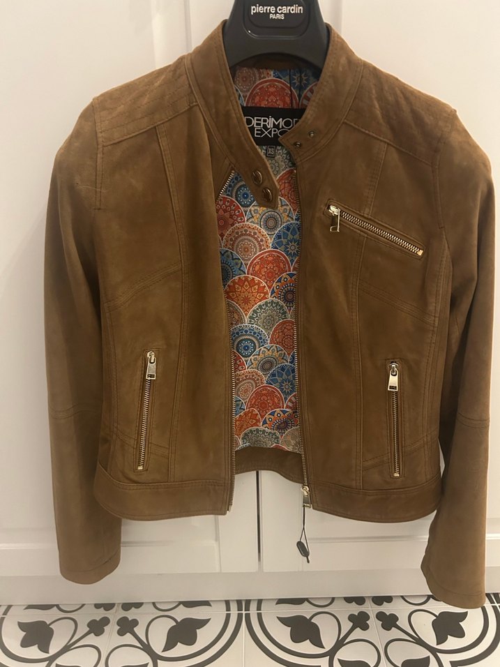 Kahverengi gerçek süet kadın biker ceket, dar kesim, bisiklet yaka ve uzun kolludur. Fermuarlı cepleri ve bağlama desenli astarı vardır.