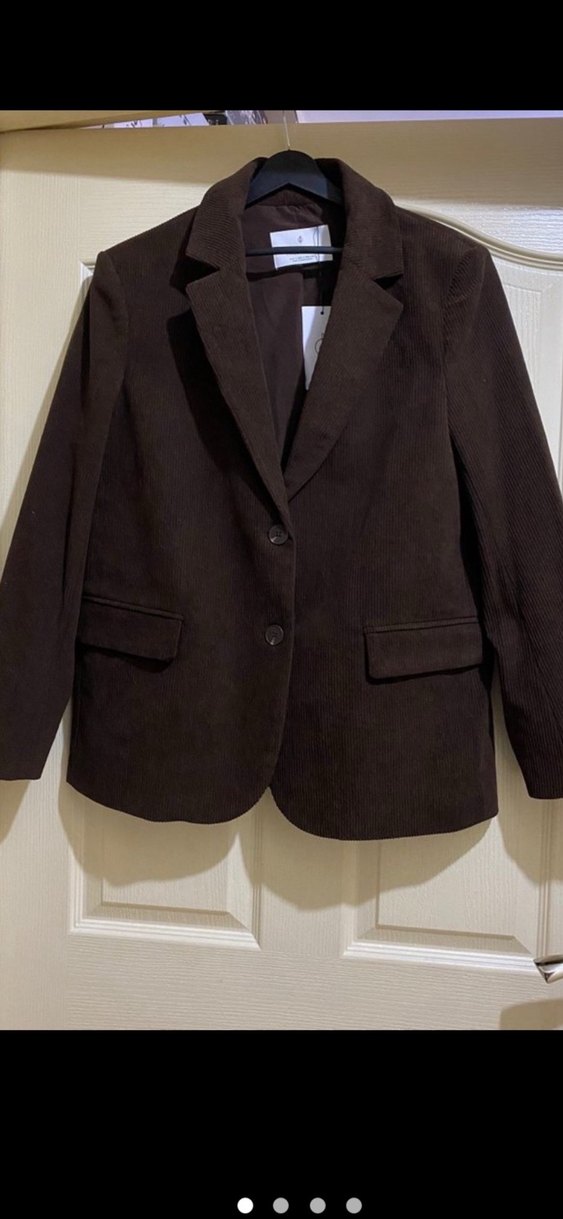 Kahverengi süet kumaştan yapılmış, düğmeli, uzun kollu kadın blazer ceket. Normal midi uzunlukta, ofis ve günlük şık sokak stili için uygun.