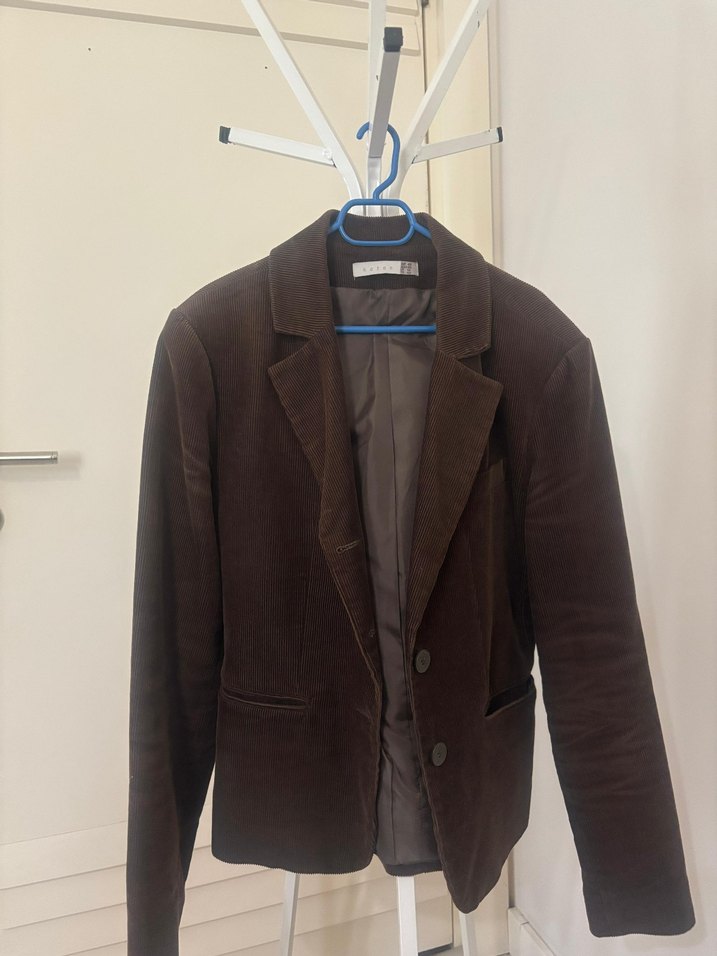 Kahverengi süet kadın blazer ceket, kesik yaka ve düğmeli ön detaylıdır. Normal kesim, uzun kollu ve midi boydadır, ofis ve sokak stili için uygundur.