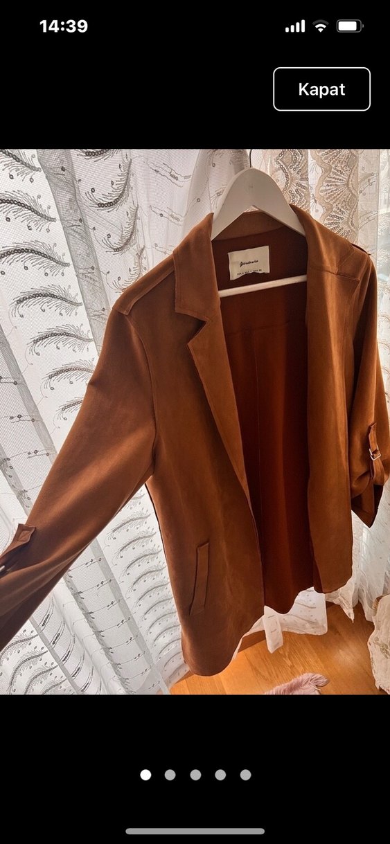 Kahverengi süet kumaştan, düğmeli, uzun kollu ve normal kesim midi boy blazer ceket. Günlük sokak stiline uygun şık bir parça.