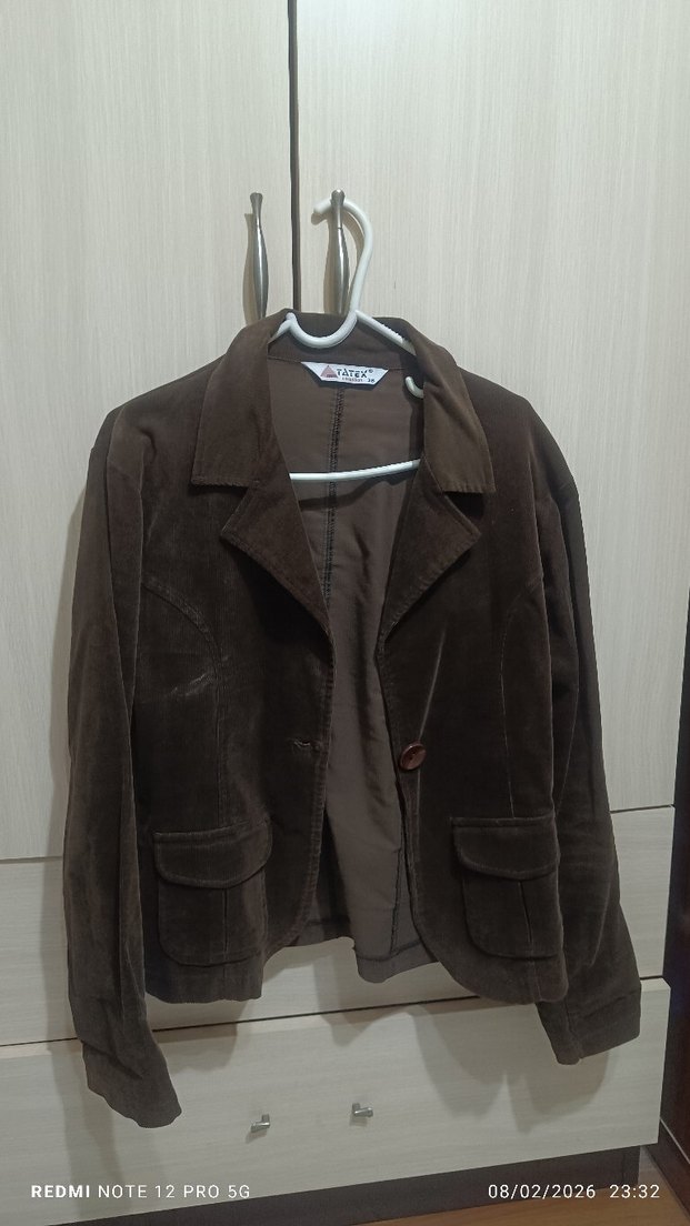 Kahverengi kadife blazer, yakalı ve düğmeli. Uzun kollu, normal kesim, midi boyda. Ofis ve günlük sokak stili için uygun. Desensiz ve rahat.