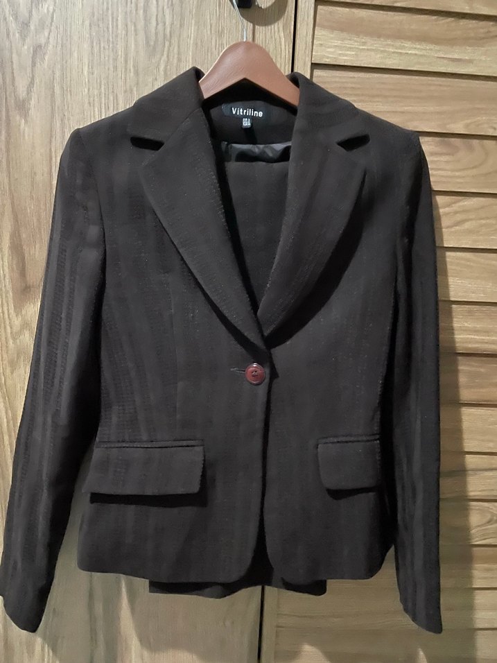 Kahverengi süet kumaştan yapılmış, düğmeli, klasik kesim kadın blazer ceket. Ofis kullanımı için uygun, uzun kollu ve normal boyda.