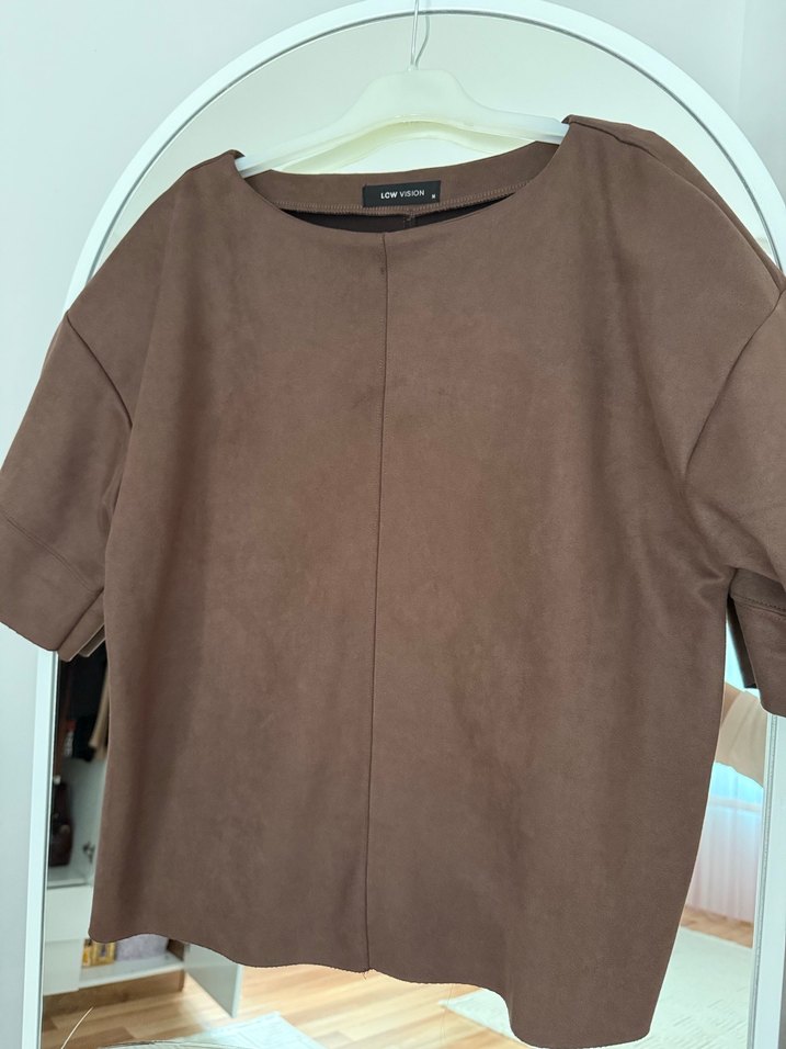 Kahverengi süet bluz, yuvarlak yaka ve kısa kolludur. Salaş kesimi ve normal boyu ile minimal desensiz, günlük kullanıma uygun rahat bir şıklık sunar.