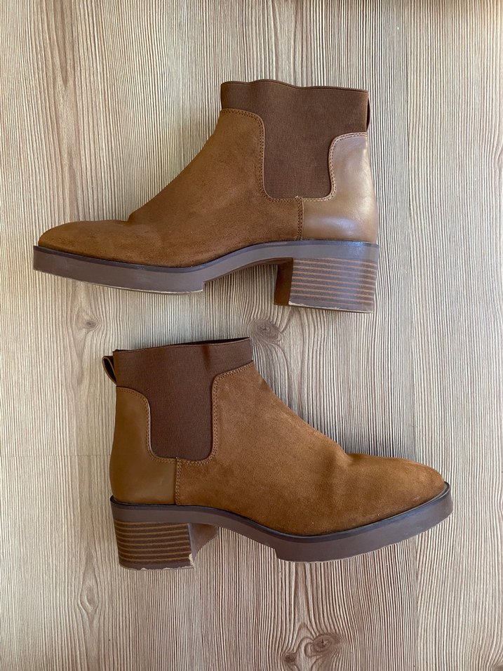 Kahverengi süet kadın bot, kalın topuklu ve tokalı detaylara sahip. Minimalist, çağdaş tasarımı günlük kullanım için uygundur, desensiz ve sade görünümlüdür.