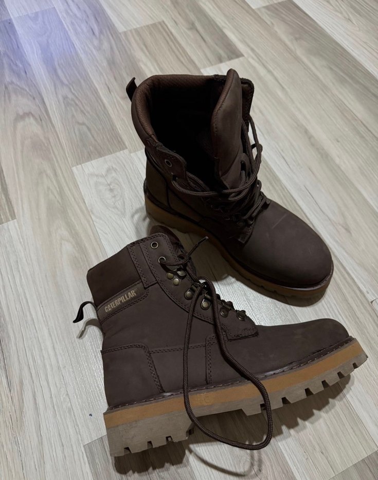 Kahverengi süet kadın botlar, kama topuklu ve kemerli detaylı, sağlam tabanlı ve bağcıklı tasarıma sahip günlük sokak stili botlar. CAT ORJİNAL