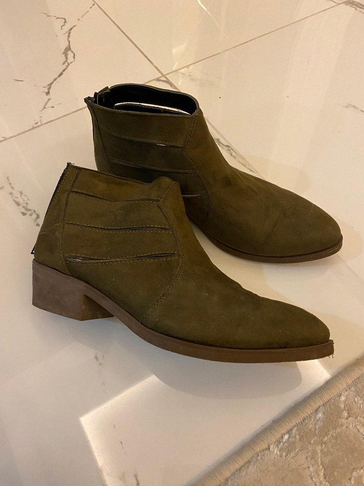 Kahverengi süet kadın botu, kalın topuklu ve tokalı. Minimalist, desensiz, günlük ve trend sokak stili için uygun.