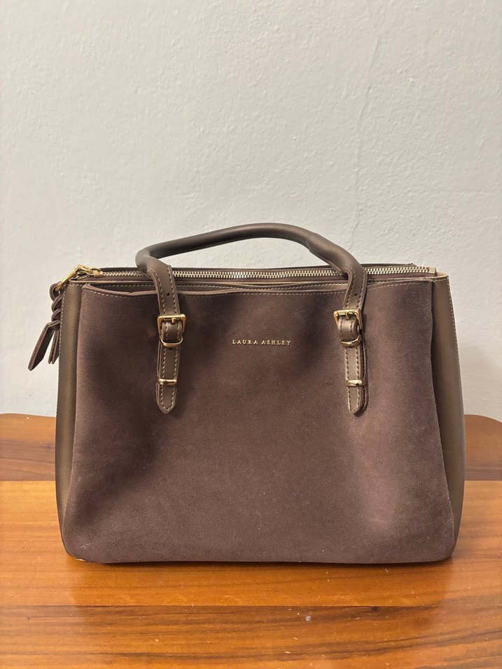 Kahverengi süet kadın çanta, tokalı saplar ve fermuarlı kapanışa sahip. Minimalist, modern klasik tasarım günlük kullanıma uygundur. Laura Ashley markası zarafet katar.