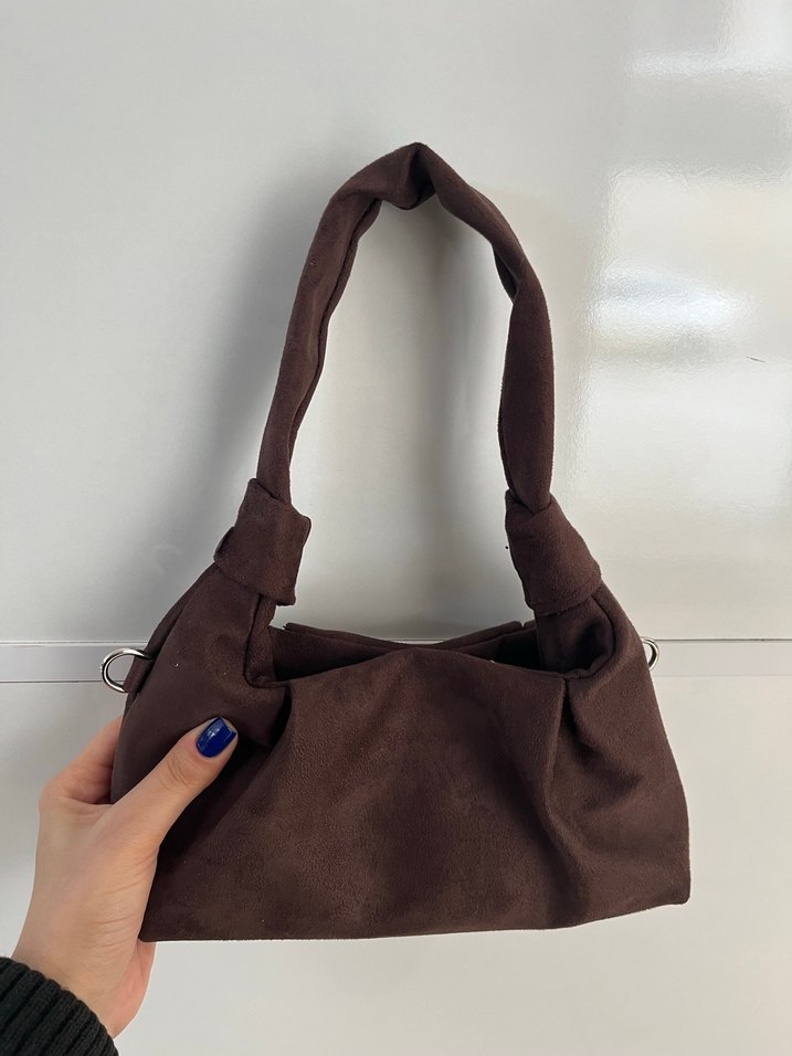 Koyu kahverengi süet dokulu, sade ve desensiz kadın çanta. Rahat taşıma için dolgulu sapı var, günlük kullanım ve sokak modasına uygun, zahmetsiz şıklık sunar.