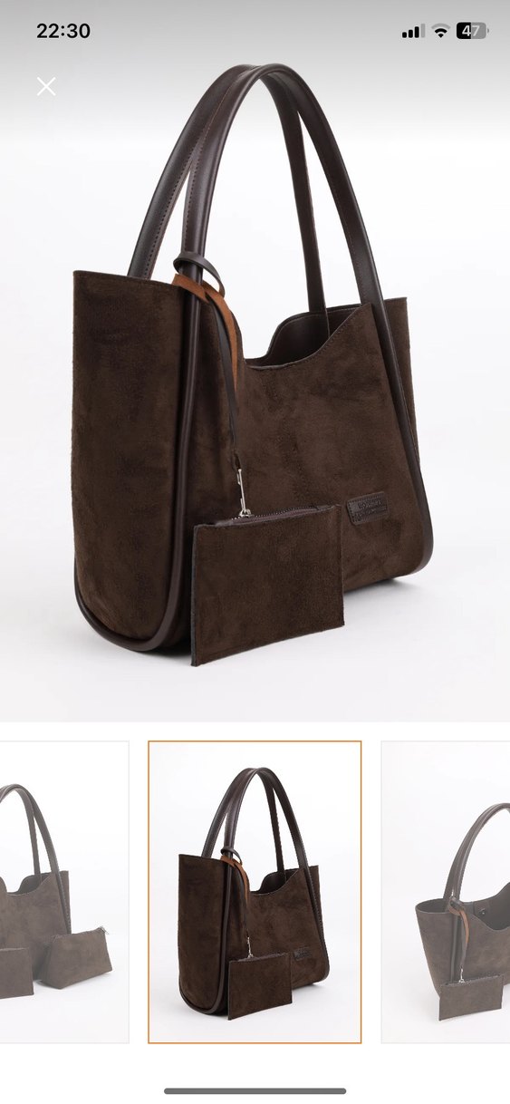 Kahverengi süet çanta, tokalı detay ve uyumlu cüzdan içerir. Minimalist, desensiz tasarımıyla günlük kullanıma uygundur. marka temsili