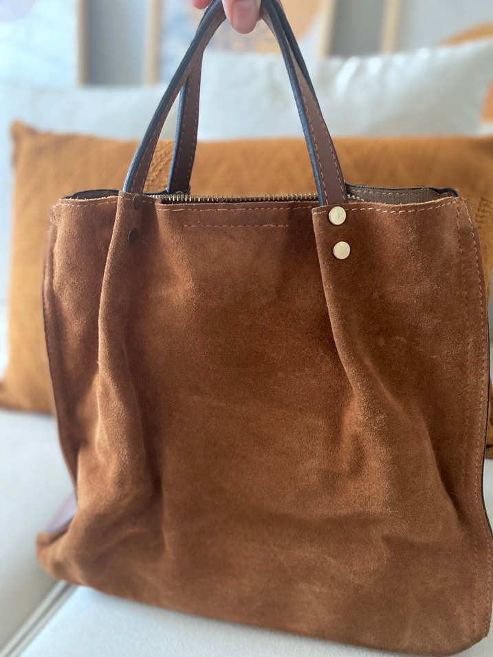 Kahverengi süet kadın çanta, fermuarlı ve sade tasarımlı, günlük kullanım için uygun bohem tarzda. ✨
