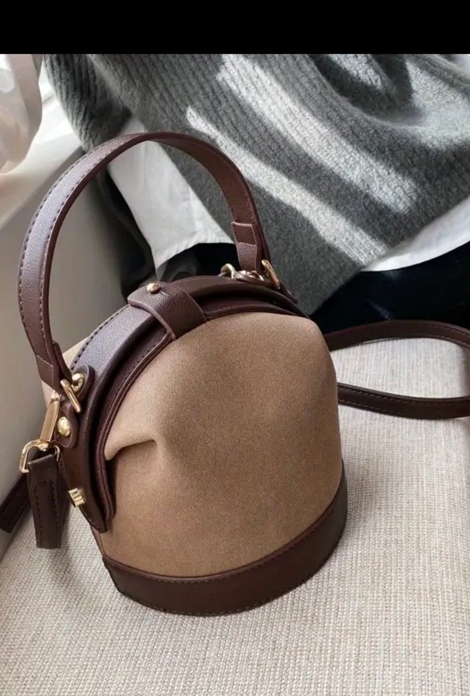 Kahverengi süet malzemeden yapılmış, kemer detaylı ve çağdaş tasarıma sahip kadın çantası. Günlük kullanım için uygundur.