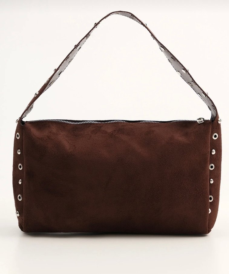Kahverengi süet malzemeden yapılmış, tokalı, sade ve çağdaş tasarıma sahip kadın çantası. Günlük kullanıma uygundur.