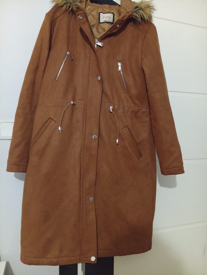 Kahverengi süet malzemeden, kürklü kapüşonlu ve çıtçıtlı, fermuarlı ceplere sahip midi boy kadın ceket. Salaş kesim ve sokak tarzı için uygun.