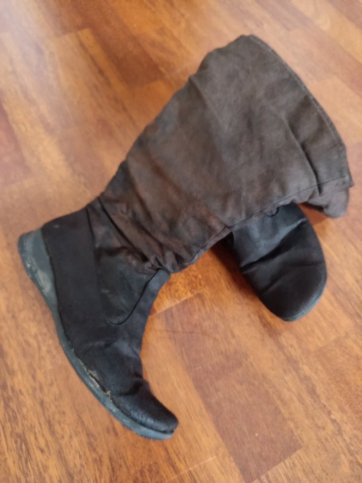 Yumuşak süet malzemeden yapılmış, koyu kahverengi rahat çizme, kama topuklu ve gotik tarzda şık görünüme sahip. Hafif acılmalar var ve daha önce boyanmıştır.