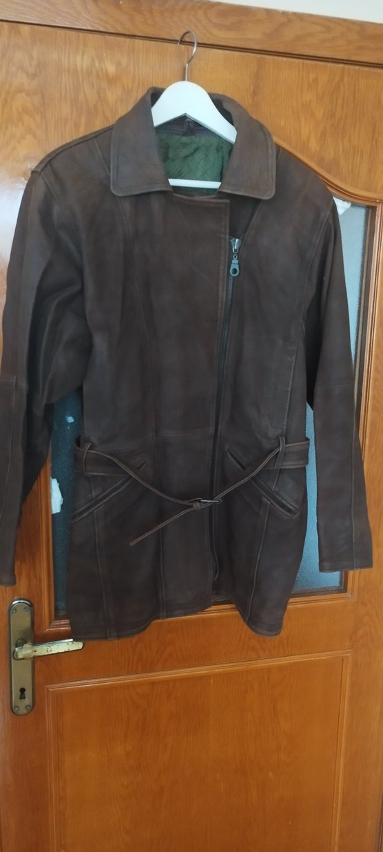 Kahverengi süet kadın deri ceket, kesik yaka, uzun kollu ve kemerli bel ile regular fit. Uzun boyu ve günlük sokak stili için uygun.