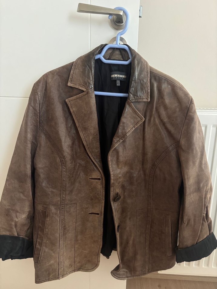 Kahverengi süet kadın deri ceket, kesik yakalı ve düğmeli ön kapamalı. Uzun kollu, normal kesim ve midi boyda, klasik ve sokak stiline uygun, ofis kullanımına ideal.
