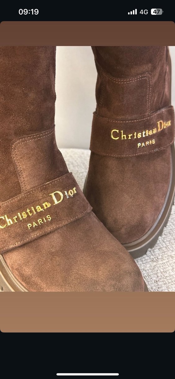 Kahverengi süet dizüstü botlar, kürk detaylı ve nakışlı desenlere sahip. Parlak platform topuklu Christian Dior Paris botları, trend sokak stili için uygundur.