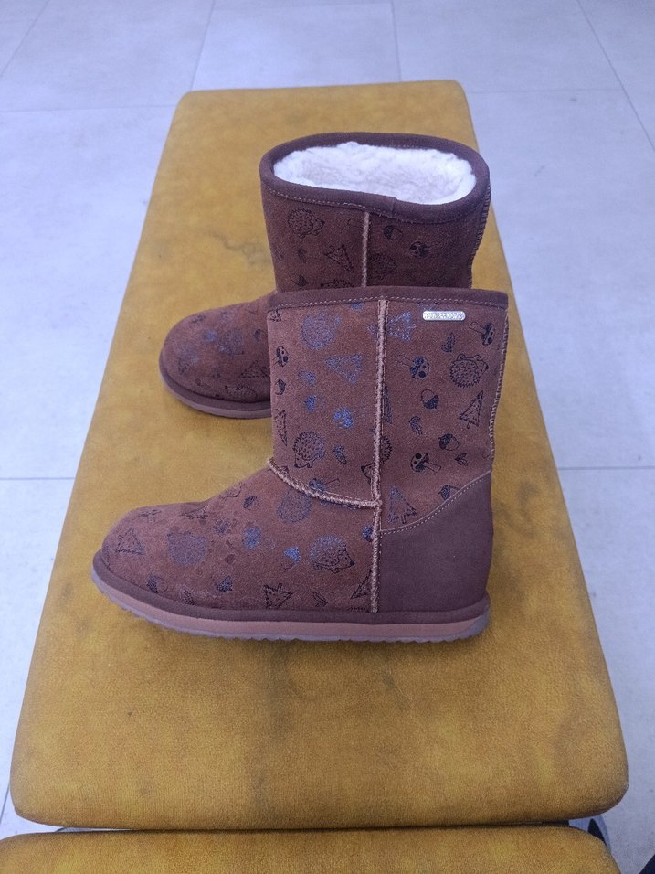 Kahverengi süet kadın botları, dolgu topuklu ve tokalı detaylara sahip. İç kısmı sıcak tutan yumuşak kumaşla kaplı, desenli tasarımlı.